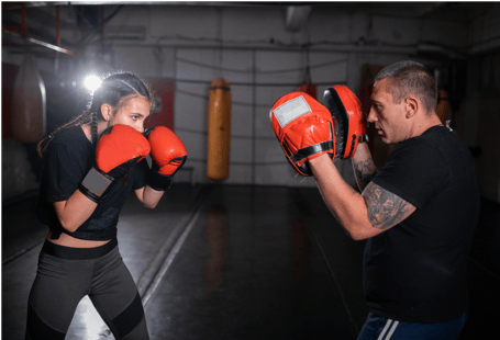 Hier trainierst Du u.a.: Schlagtechniken am Sandsack, Seilspringen, Beinarbeit, Partnertraining mit Pratzen, Kick-Varianten (Front Kick, Side Kick usw).
